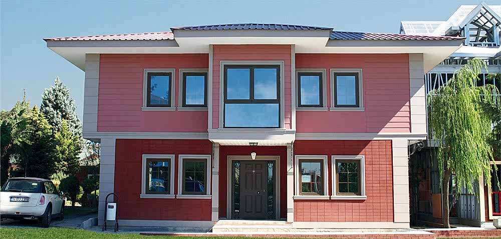 Prefabrik evlerin taşıyıcı kontrüksiyonu ST52 yüksek yoğunluklu galvanizli çelikten kaynaksız olarak üretilmektedir. Çelik evlerin bütün bağlantıları civata somunla sağlanmaktadır. Bu hazır evlerde cephe kaplamaları HEKiMBOARD marka FiBERCEMENT (silika bazlı çimentolu hazır levha) veya TURKSiDiNG marka yalıbaskı yada tuğla desenli levhalarla yapılmaktadır. Bu yapı diğer tüm hazır konutlarda da korunmaktadır. Prefabrik ev fiyatları betonarme yapılara göre çok daha uygun olmaktadır.